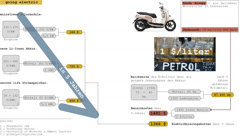 In weiten Teilen Indonesiens kommt es “regelmäßig” für einige Stunden zu Stromausfällen. In diesem Fall wird der Roller zum mobilen Stromspeicher mit dem sich diese Zeit überbrücken lässt.