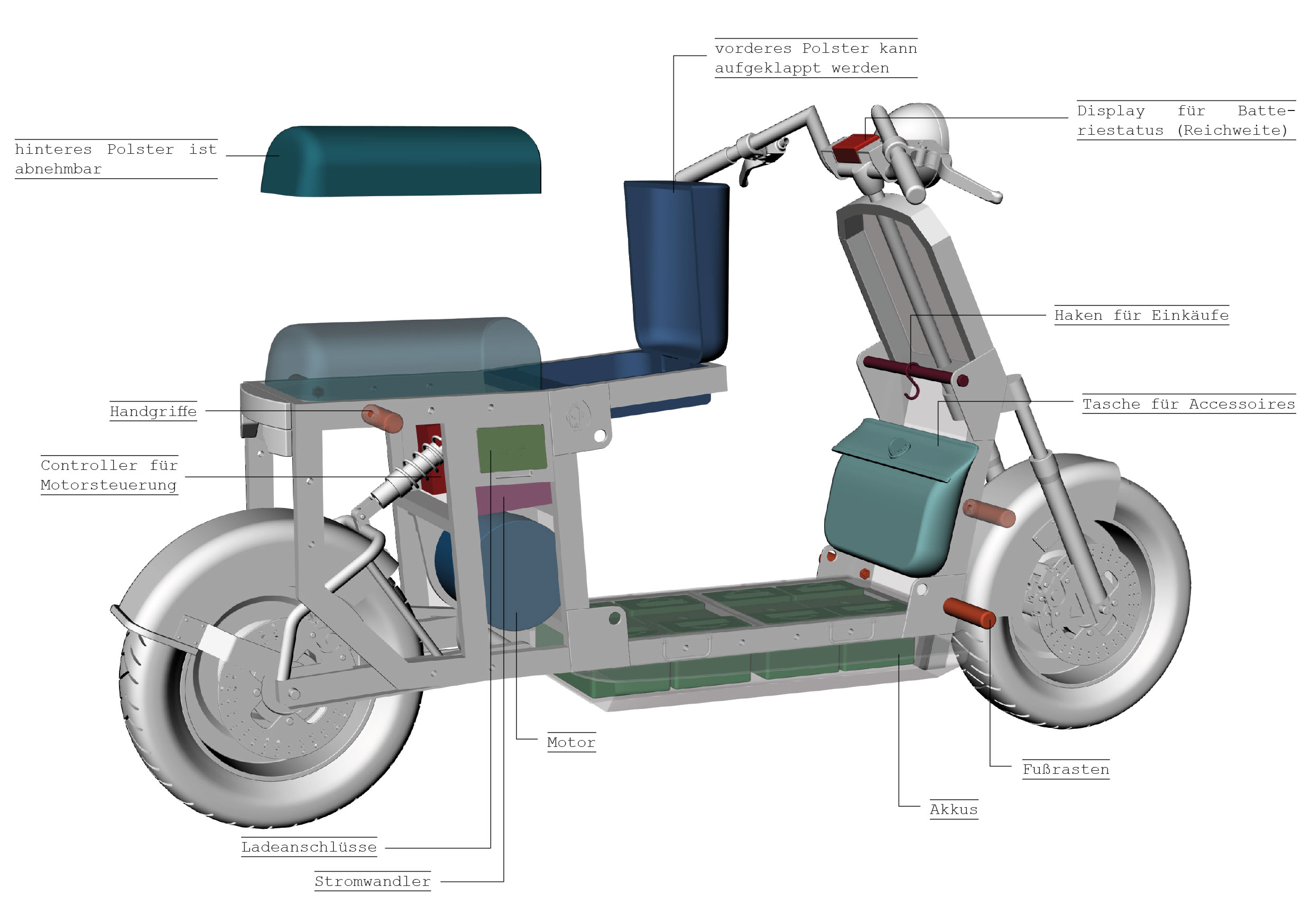 Schaut man sich die am Markt gängigen Modelle für Motorroller an, so sticht vor allem das ausgeprägte Styling ins Auge. Es finden sich viele Ecken und Kanten, welche die Transportmöglichkeiten unnötig einschränken.