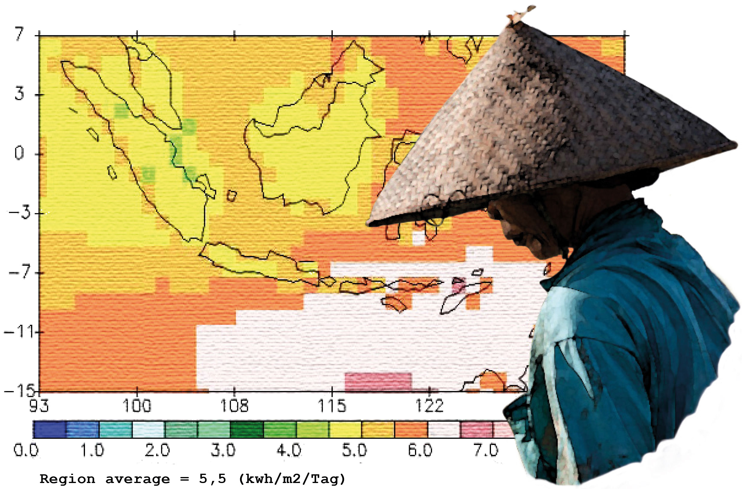 Die tägliche Sonneneinstrahlung ist in Indonesien im Durchschnitt etwa 5 Mal so hoch wie in Deutschland.