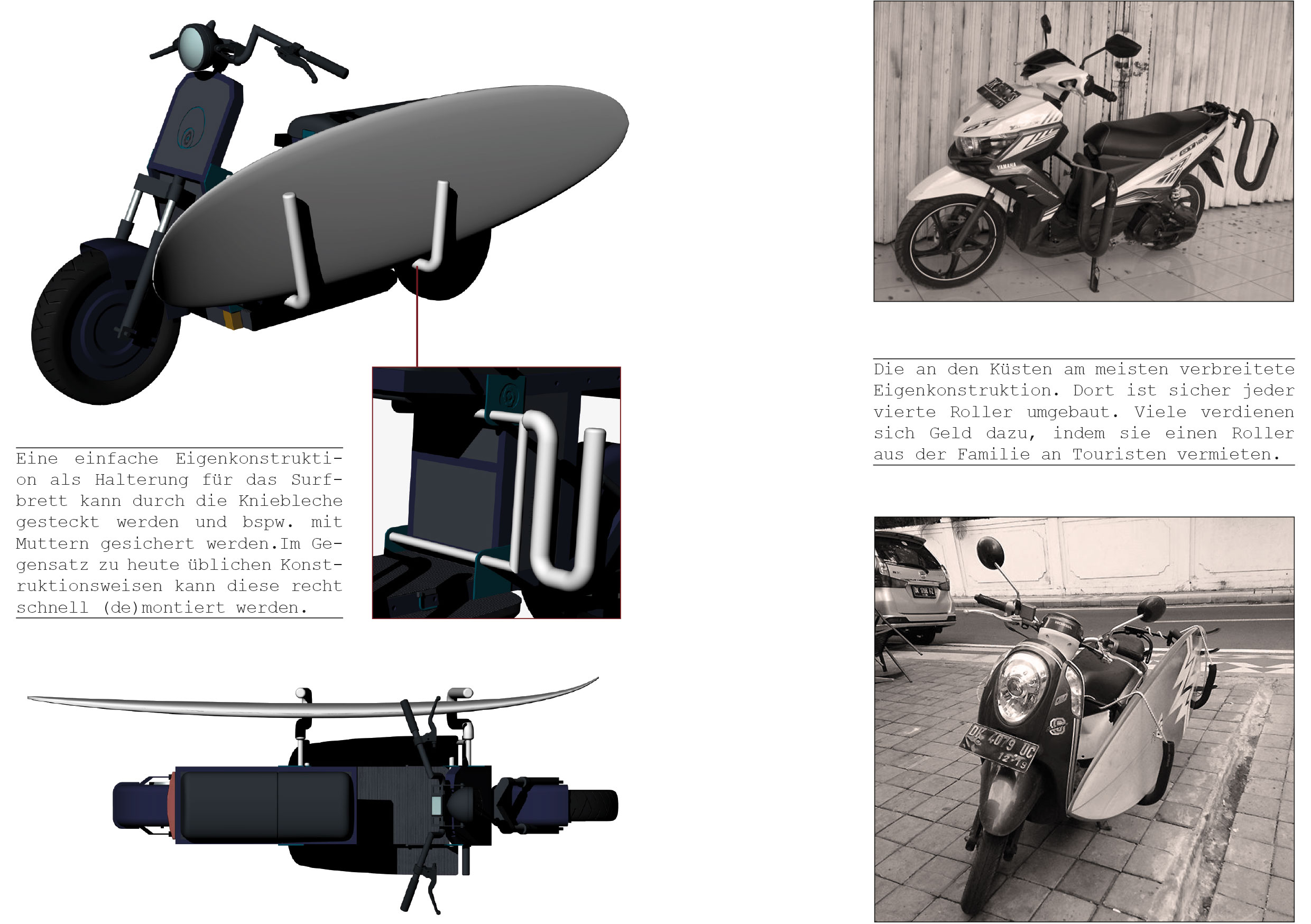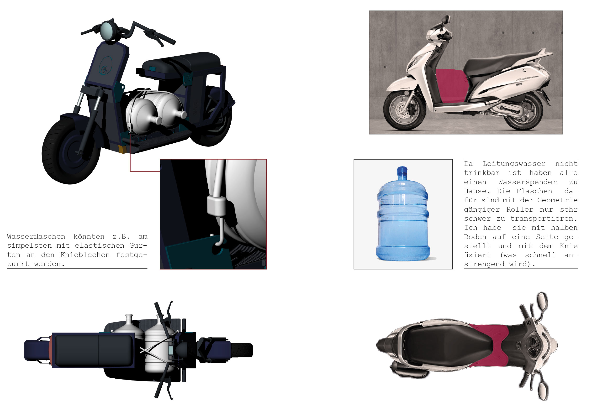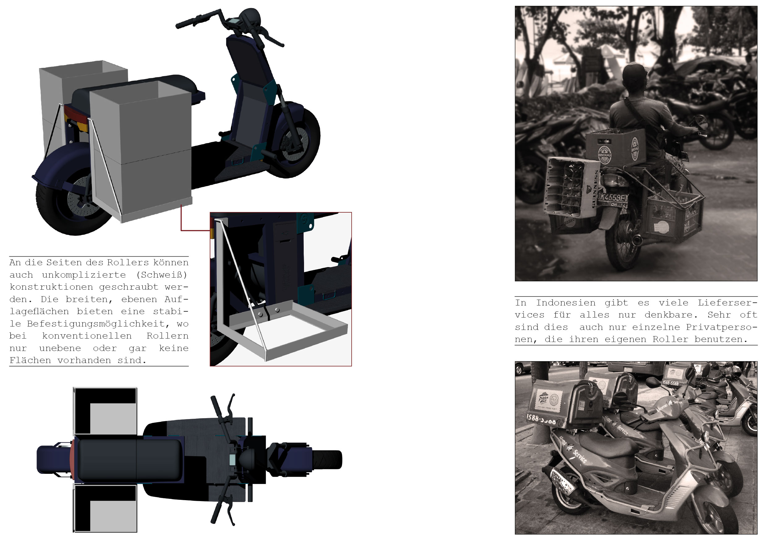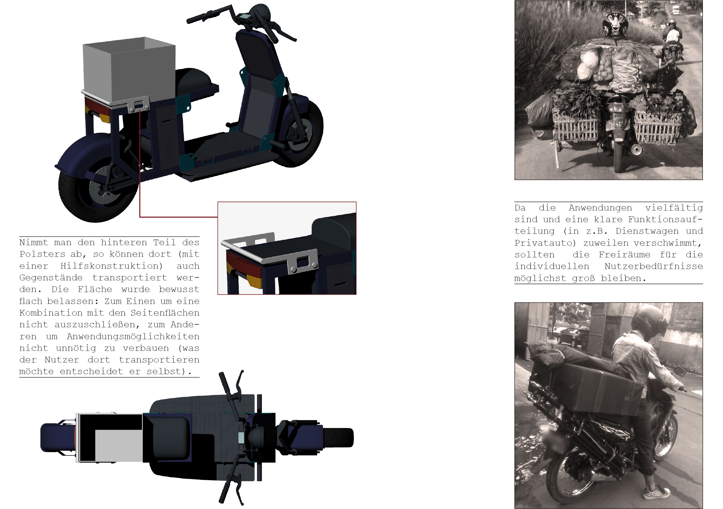 Was der Nutzer mit seinem Roller transportieren möchte entscheidet er selbst. Die dazu erforderliche Halterung kann er sich bei einem lokalen Handwerker (sehr günstig) bauen lassen.
